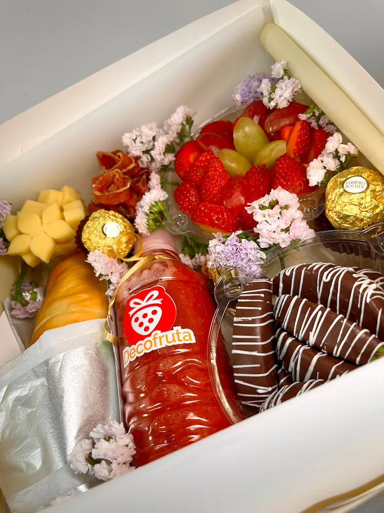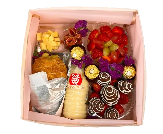 #2 croissant jamon y queso+ensalada de frutas+fresas con chocolate+embutidos+jugo de piña+bombones